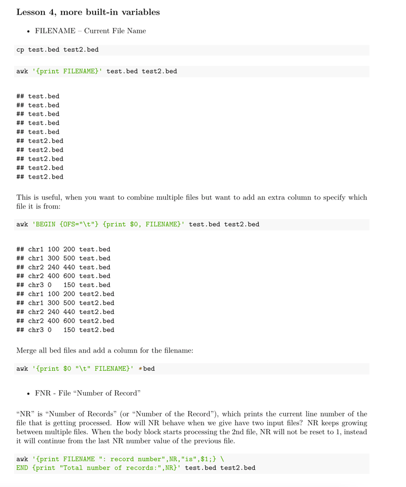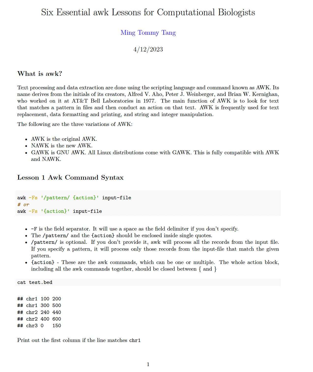 In this 12-page PDF file, you will learn the essential lessons of awk for computational biologists.