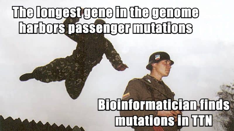 Hey Bioinformatics lovers, Tommy here. Everyone once was a beginner, and I made mistakes too. However, the experience is something you gained by making those mistakes. TTN shows up near the top of every cancer exome waterfall plot. If you're new to somatic variant analysis, you'll see it and think you found a driver. You didn't. TTN encodes titin, the largest human protein at ~34,000 amino acids. The gene has 363 exons. A coding sequence that massive collects somatic mutations the way a large target collects stray arrows — by sheer size, not by biological selection. In cancer genomics, TTN is a passenger. TTN mutation counts track with tumor mutational burden (TMB). In TCGA's pan-cancer cohort of 10,000+ samples, TTN mutation frequency correlated with TMB at rho = 0.917. Tumors with high microsatellite instability (MSI-H) light up TTN because they accumulate mutations genome-wide, and TTN's coding region is the biggest target. Some groups now use TTN mutation count as a single-gene proxy for TMB. That's a legitimate use — and about the only one TTN earns in tumor profiling. Don't build a biological narrative around TTN mutations in your cancer exome. There's no driver story there. In cardiology, TTN mutations are real — but context is everything. Truncating variants in A-band exons with high cardiac expression cause dilated cardiomyopathy (DCM). These are well-validated, clinically actionable findings. But many TTN truncations land in alternatively spliced exons with low cardiac PSI (proportion spliced in). Those exons produce transcripts that the heart barely uses. A truncation in an exon with PSI < 0.5 is a different beast than one in a constitutively expressed A-band exon. The variant type alone — missense, truncating, frameshift — doesn't tell you enough. You need to check which exon got hit and whether the heart actually expresses it. Two rules for TTN: Correct for gene length before you call TTN significant in a burden test. And check exon-level cardiac expression (PSI) before you call a TTN variant pathogenic. The biggest gene in the genome, the biggest interpretation headache in your results. If you want to dig deeper: Roberts et al. 2015 laid out the PSI framework for interpreting TTN truncations. Oh et al. 2020 (npj Genomic Medicine) formalized the TTN-as-TMB-proxy approach with TCGA data. Happy Learning! Tommy aka crazyhottommy PS: If you want to learn Bioinformatics, there are four ways that I can help: